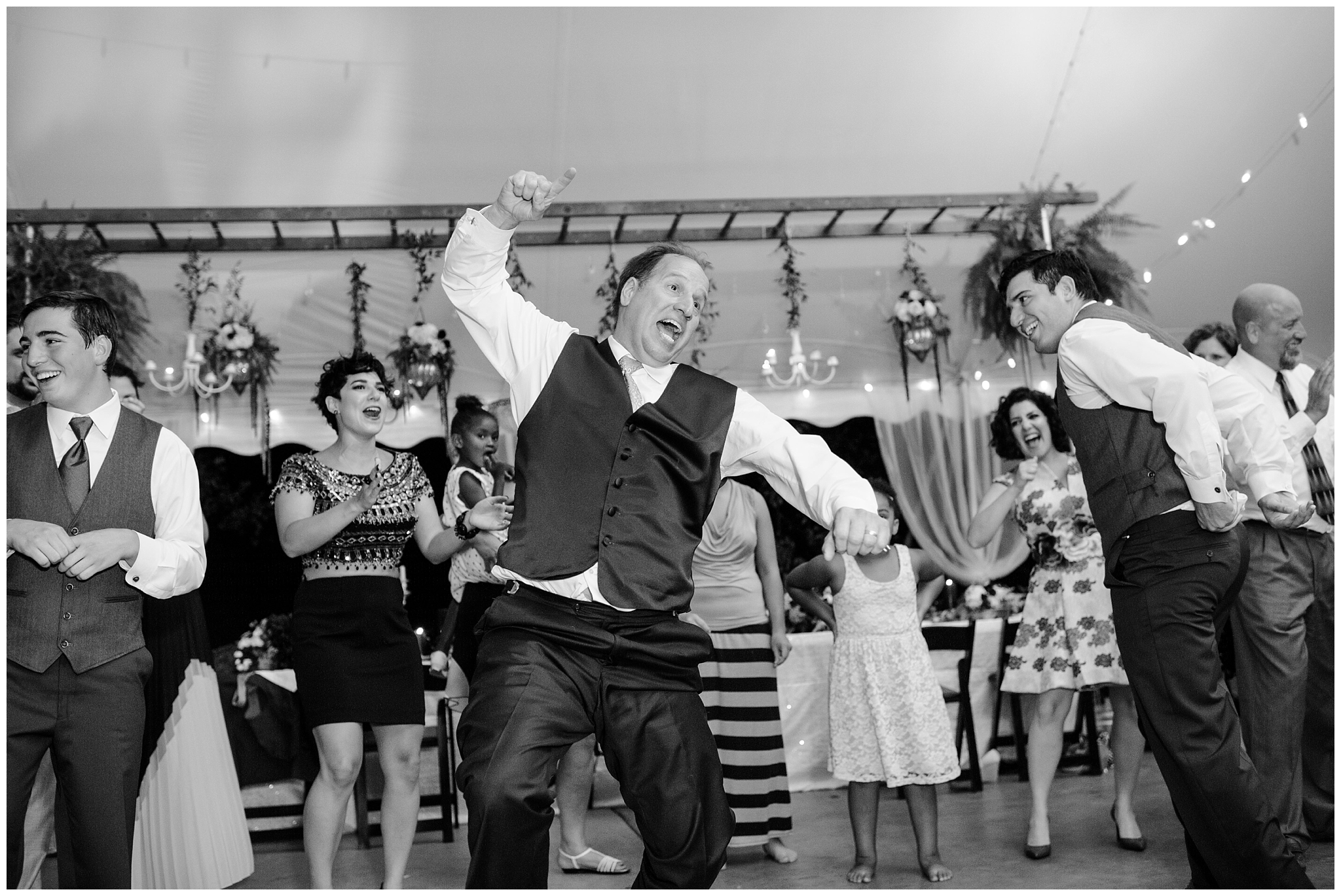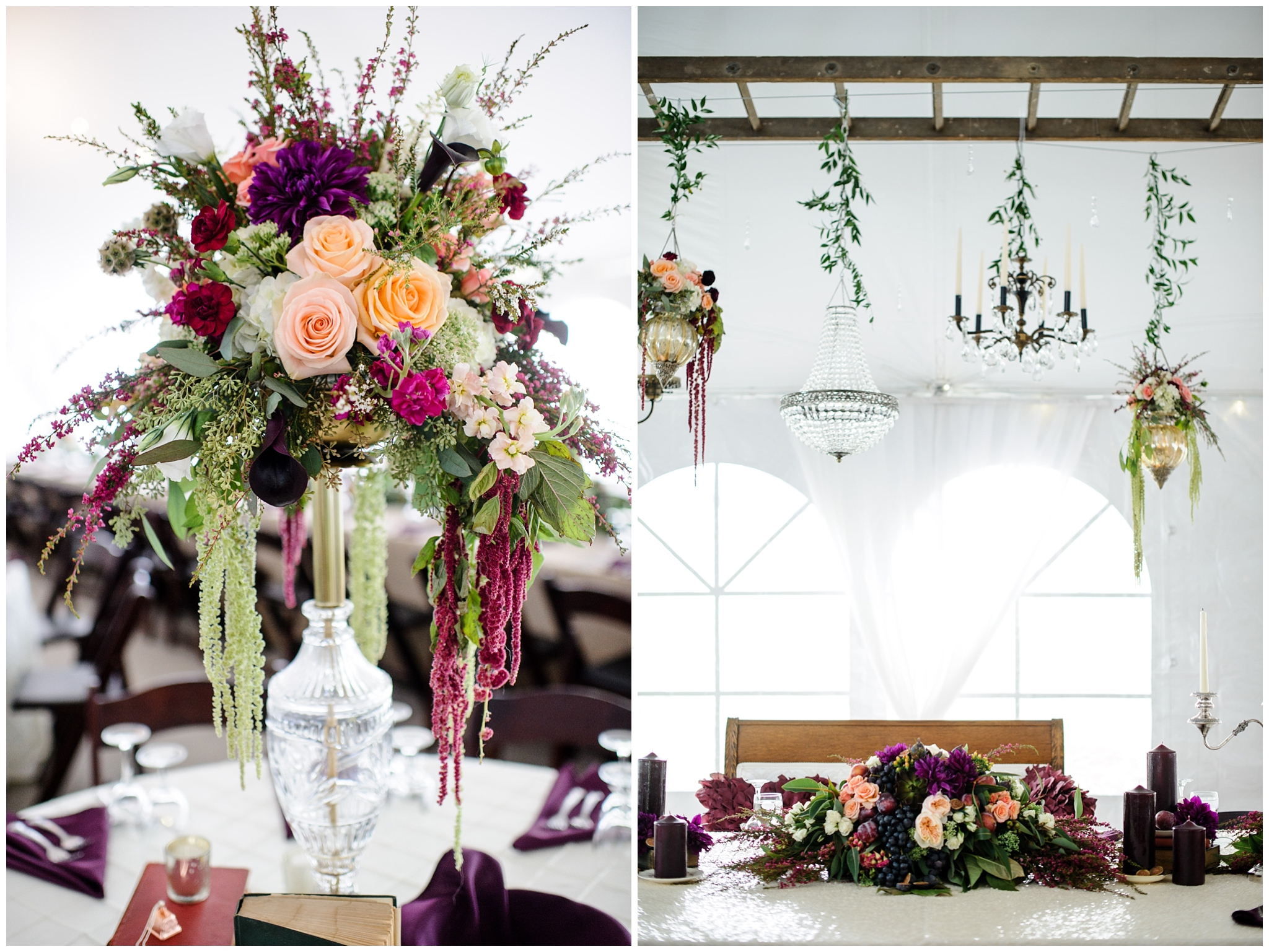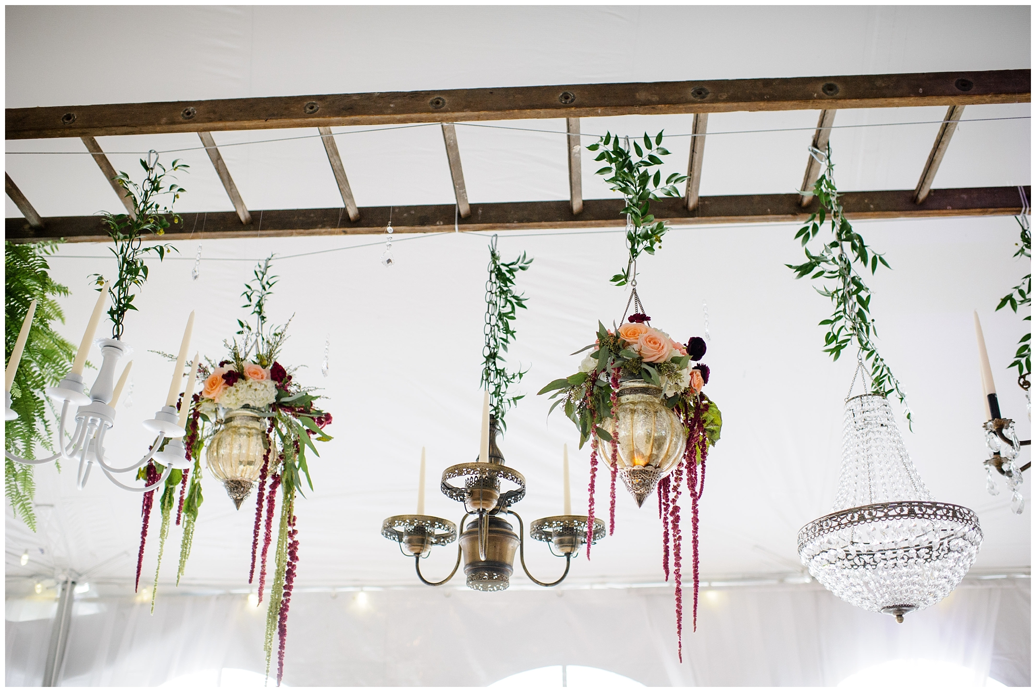 That is indeed a ladder from the barn hung above the head table with flowers and chandeliers hanging from it!